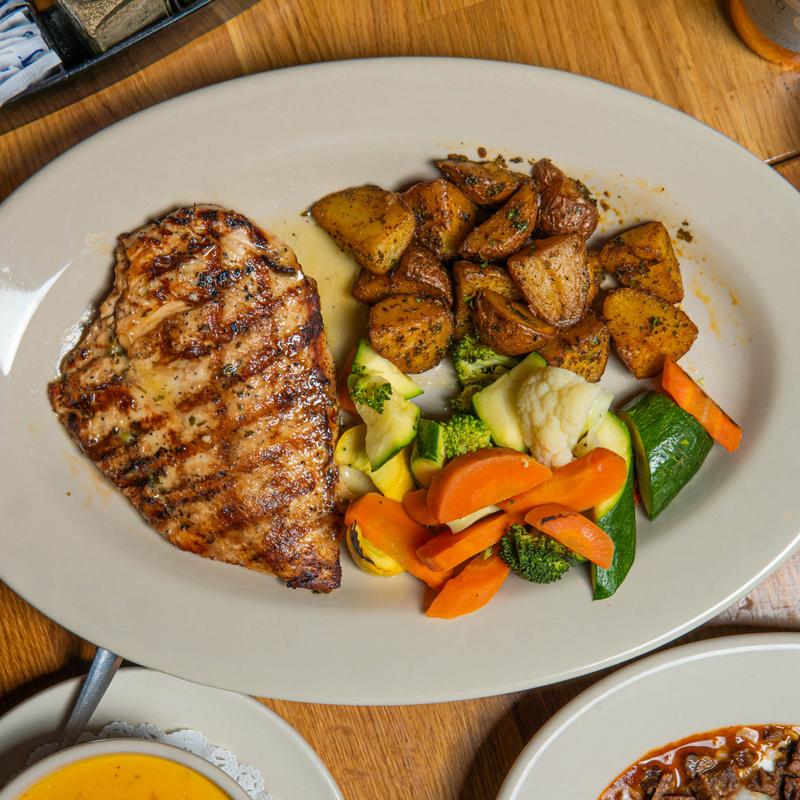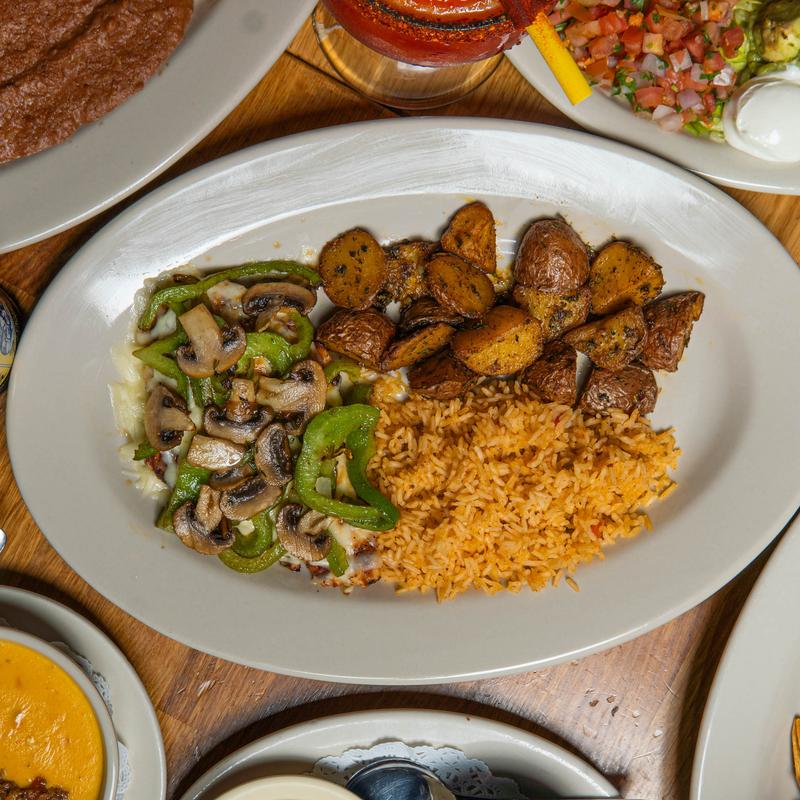 Grilled chicken breast topped with melted Monterrey jack cheese, green bell peppers, and seasoned mushrooms. Served with rice and roasted red potatoes.