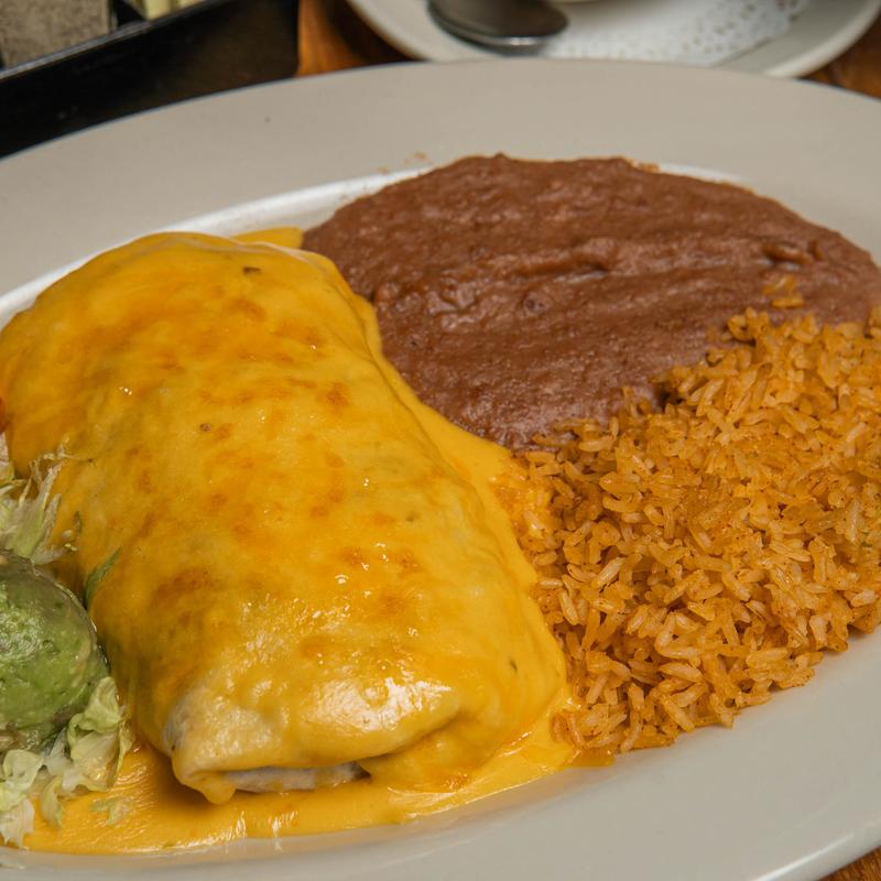 A large flour tortilla filled with your choice of chicken or beef fajita, cheese, and refried beans. Topped with the sauce of your choice. Served with rice, refried beans, and guacamole | Combo +$1.00