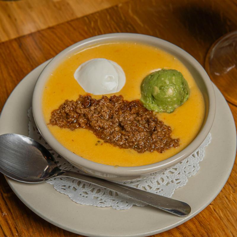 Small $7.49 | Large $8.49 • Chile con queso topped with sour cream, guacamole, and ground sirloin.