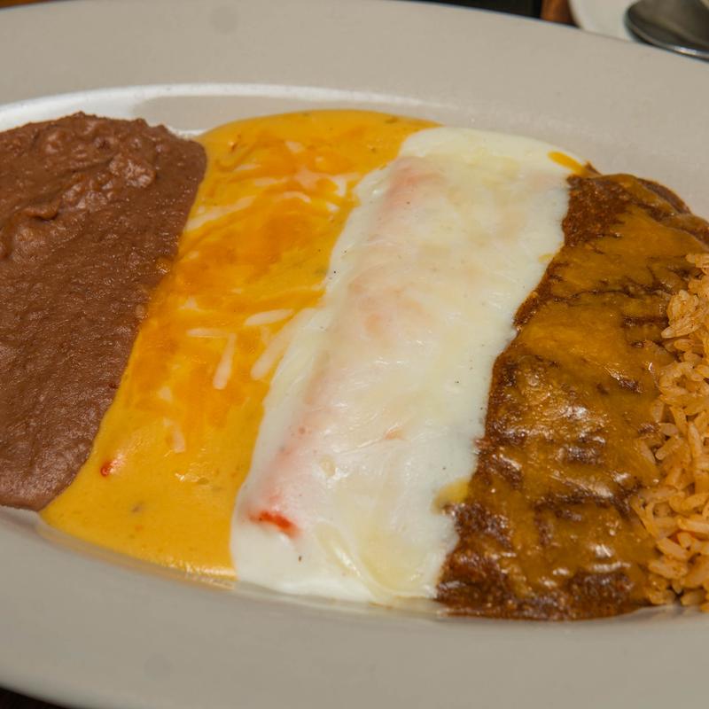 Your choice of one beef, cheese, or chicken enchilada, topped with the sauce of your choice. Served with rice and refried beans.