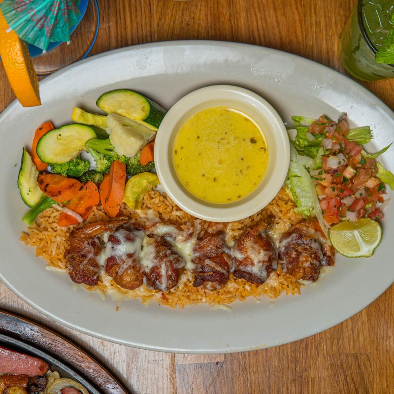 (6) Fried jumbo shrimp stuffed with Monterrey jack cheese, wrapped with bacon, on a bed of rice. Served with grilled vegetables, lime garlic butter sauce, and pico de gallo.