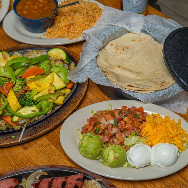 Fajitas are served with flour or corn tortillas, rice, charro beans, sour cream, guacamole, pico de gallo, and shredded cheese on a bed of lettuce.