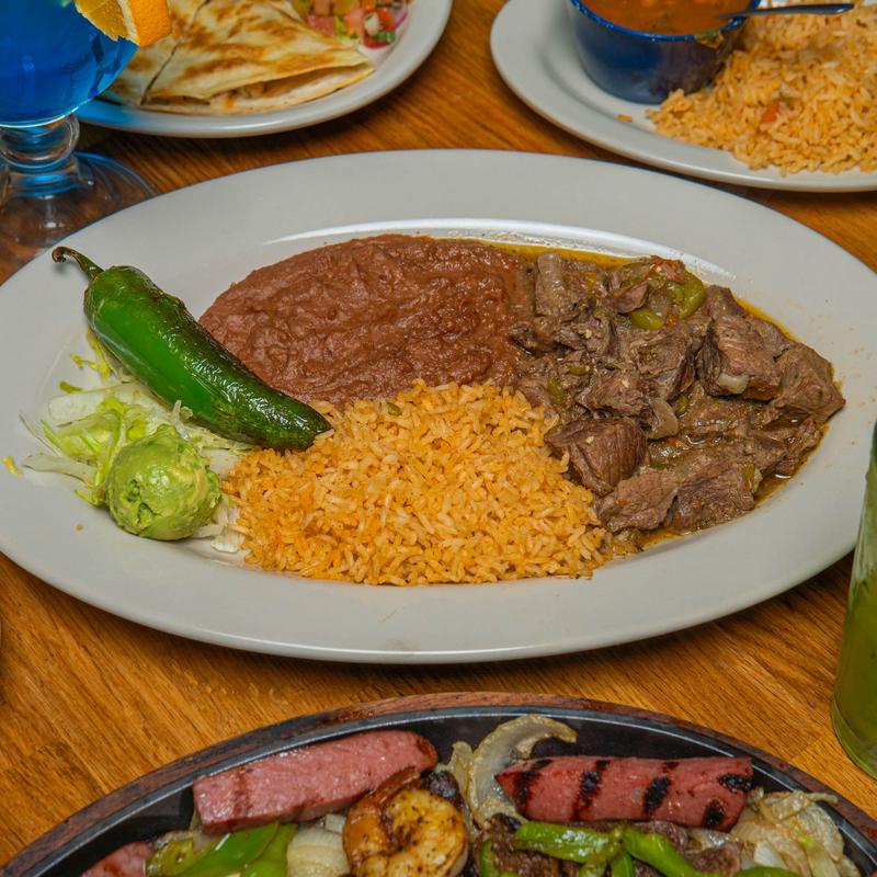 Beef tips with tomatoes, onions, and bell peppers. Served with. rice and refried beans. And (2) flour tortillas.